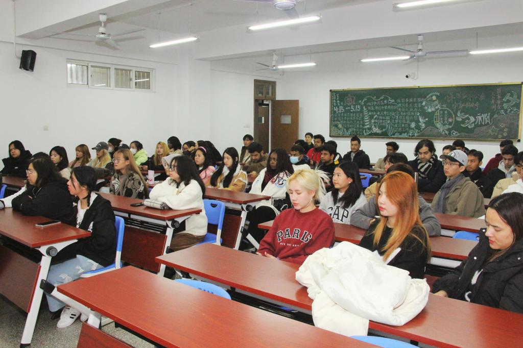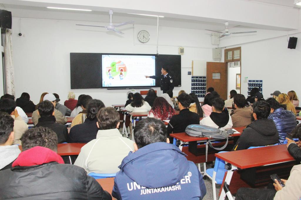 为加强我校来华留学生法律法规教育,提高留学生知法守法和安全防范意识,11月19日下午,保卫处联合国际教育学院共同开展来华留学生安全教育专题讲座。讲座由保卫处副处长郑红兵主讲,国际教育学院和保卫处相关负责人、全体在校留学生参加活动。