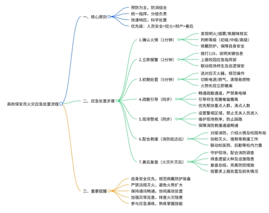 高校保安员遇火灾,需遵循“确认火情→立即报警→初期处置→疏散引导→现场警戒→配合救援→善后复盘”7个核心步骤,每个环节环环相扣,缺一不可。
